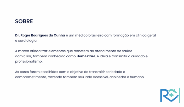 Descrição: Recebemos a missão de desenvolver a identidade visual para o Dr. Roger, médico que atua com um sistema de atendimento domiciliar (Home Care). Todo o projeto foi elaborado com base no briefing fornecido pelo cliente, respeitando sua visão e objetivos.