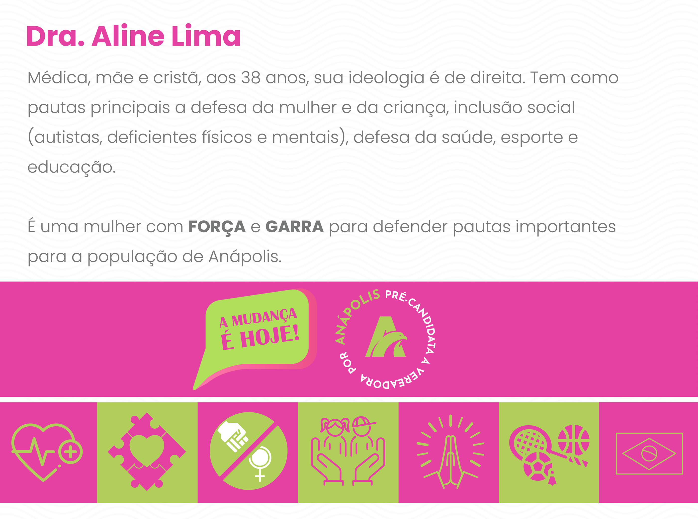 Cliente: Vereadora Dra. Aline LimaAno: 2024Descrição: Neste projeto, foram produzidos: Logotipo, Identidade visual, Fotografias, Peças digitais e impressas, Web site.